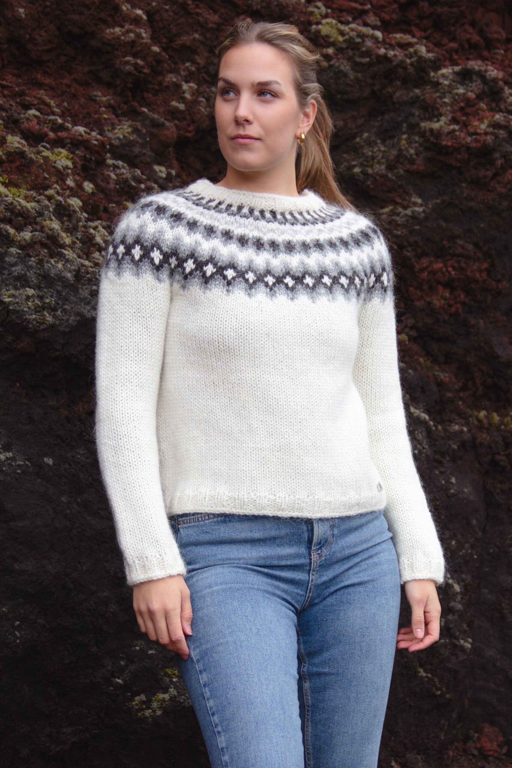 Traditional cardigan made of 100% Icelandic wool, here in a beautiful white and black/grey version.