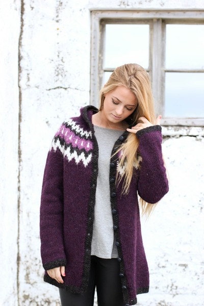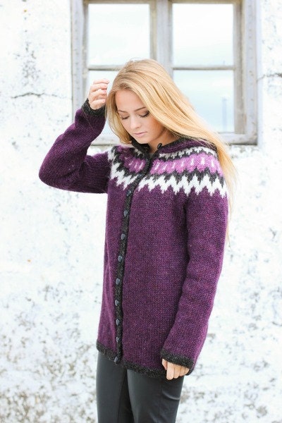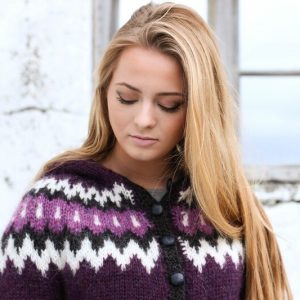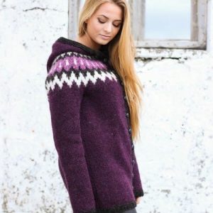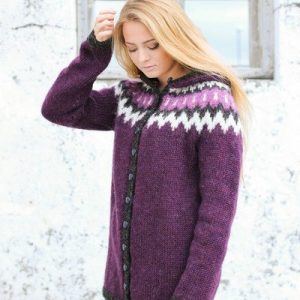 Falleg,klassísk lopapeysa með munstri sem er byggt á gömlum hefðum. Hér er hún í fjólubláum aðallit, en hægt er að velja um ótal aðrar litasamsetningar.