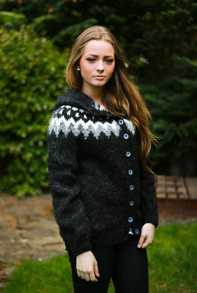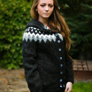 Falleg,klassísk lopapeysa með munstri sem er byggt á gömlum hefðum. Hér er hún í svörtum lit, en hægt er að velja um ótal aðrar litasamsetningar.