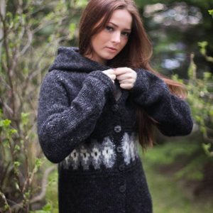 Mittið er með flottu munstri til að draga fram kvenlegar línur, og hægt er að fá hana með hettu eða kraga.