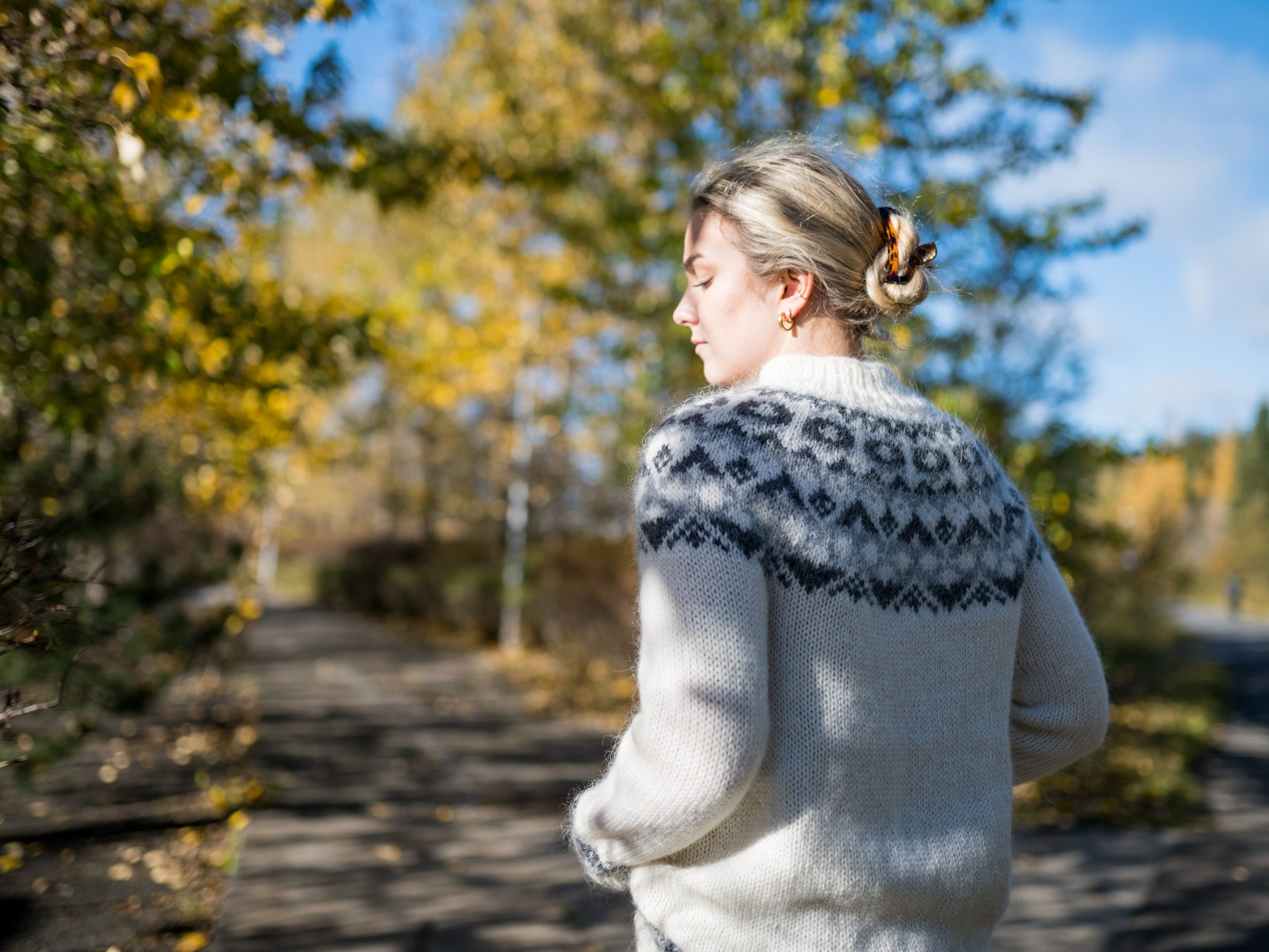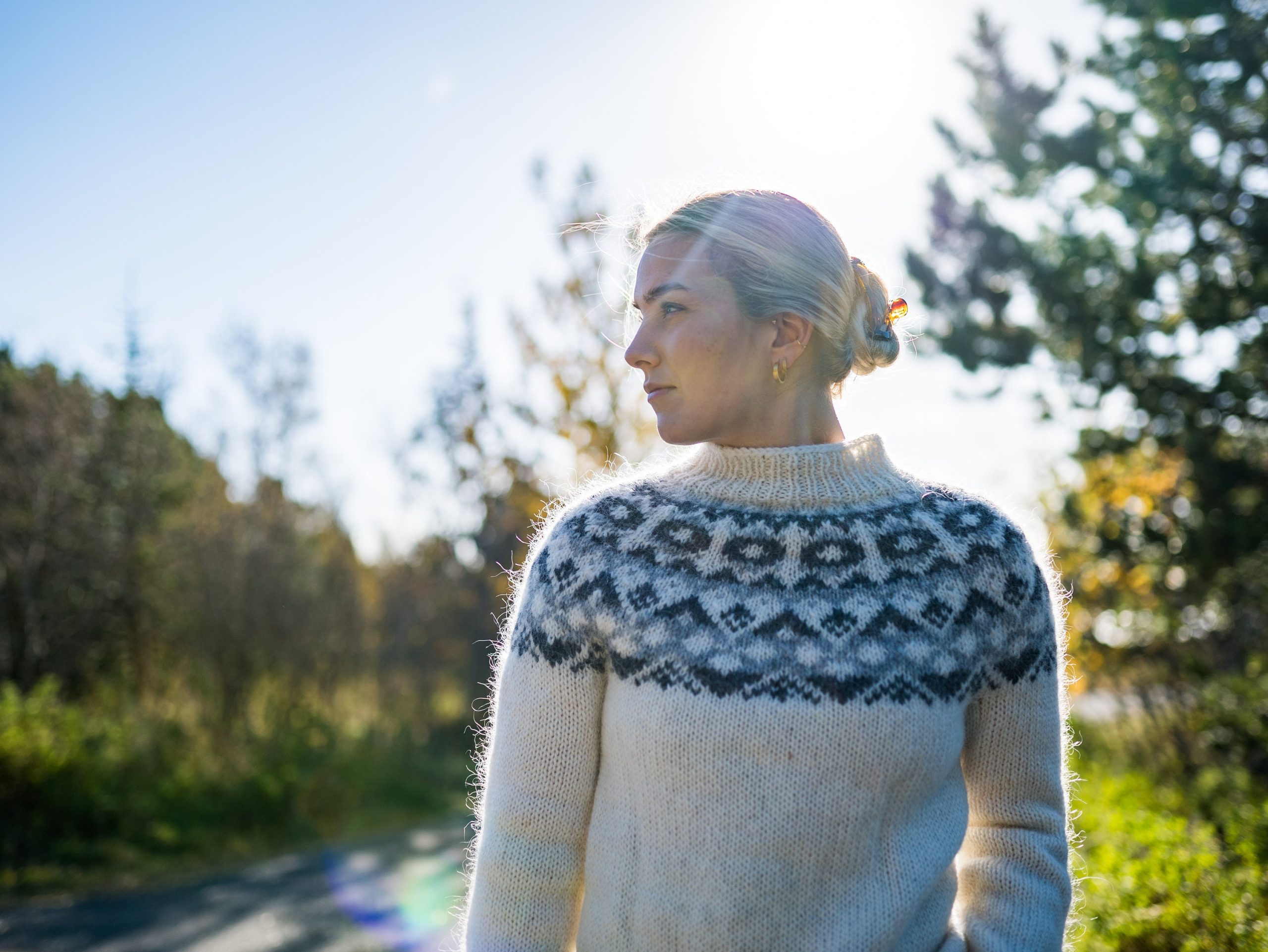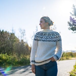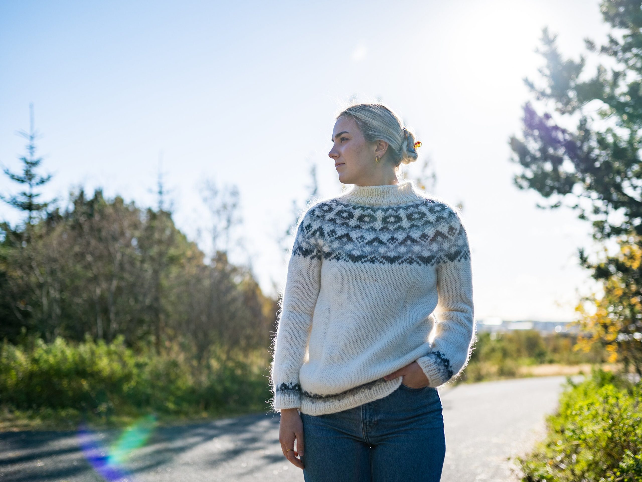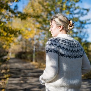 Íslenska munstrið Gjöf, heil peysa. Hér er hún í fallegri hvítri og grárri litasamsetningu