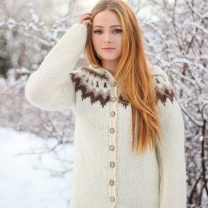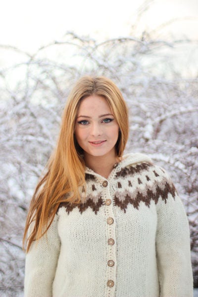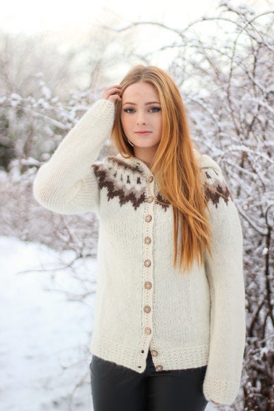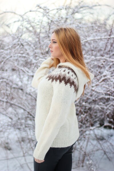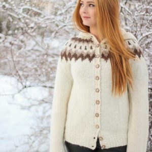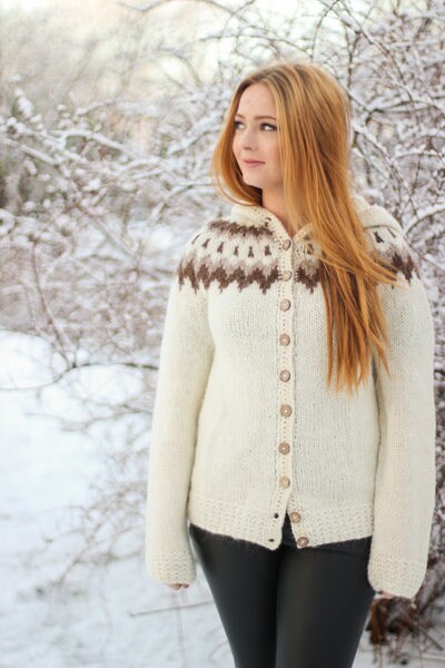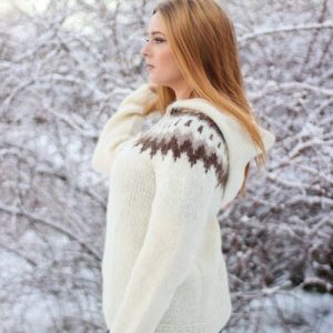 Falleg,klassísk lopapeysa með munstri sem er byggt á gömlum hefðum. Hér er hún í hvítum og brúnum litum, en hægt er að velja um ótal aðrar litasamsetningar.