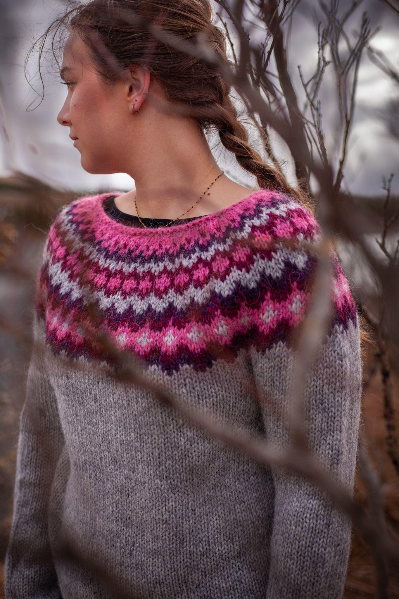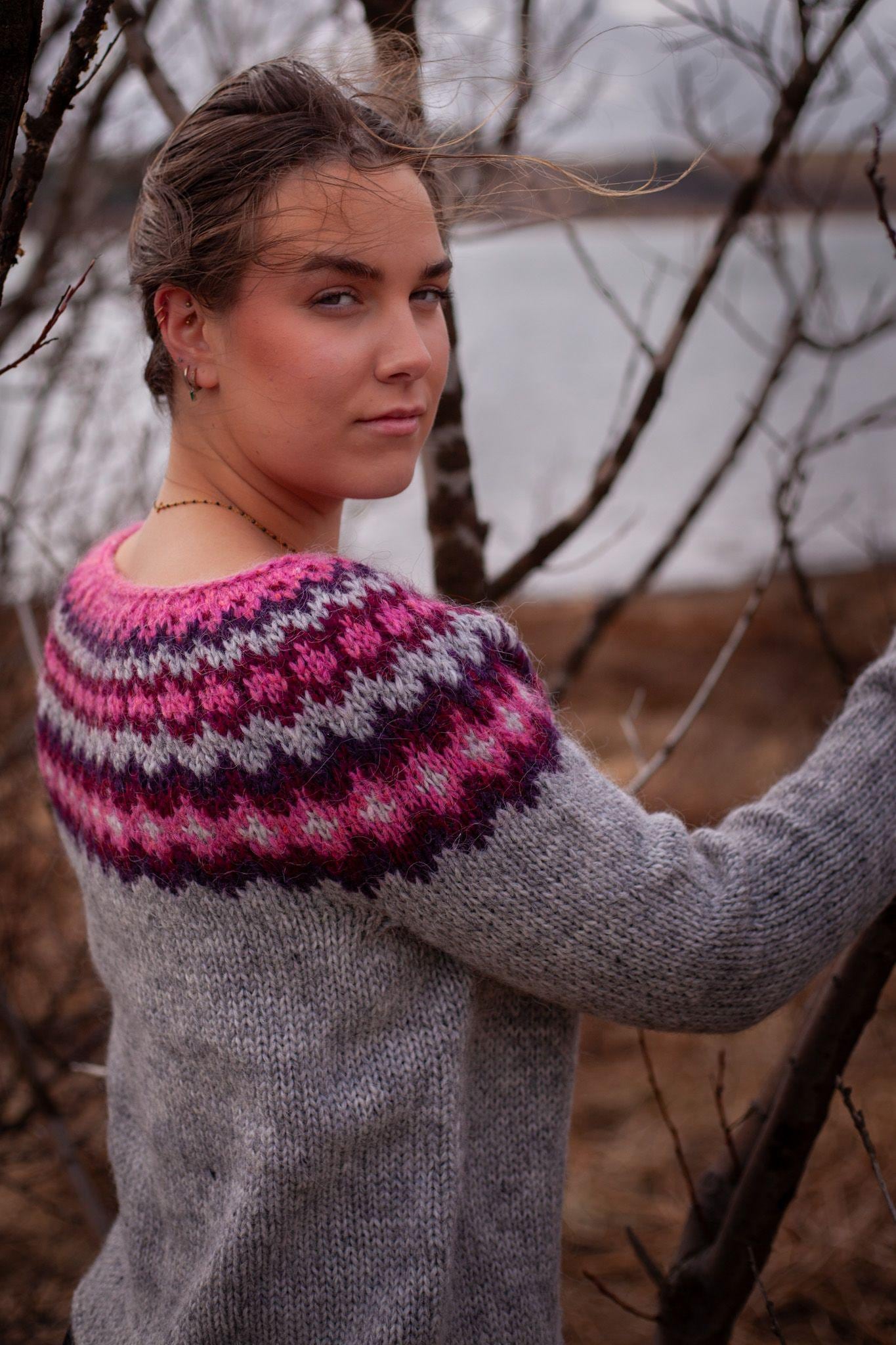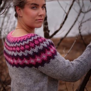 Falleg lopapeysa með munstri sem er byggt á gömlum hefðum. Hér er hún í gráum aðallit og bleikum og fjólubláum munsturlitum. Hægt er að velja um ótal aðrar litasamsetningar.