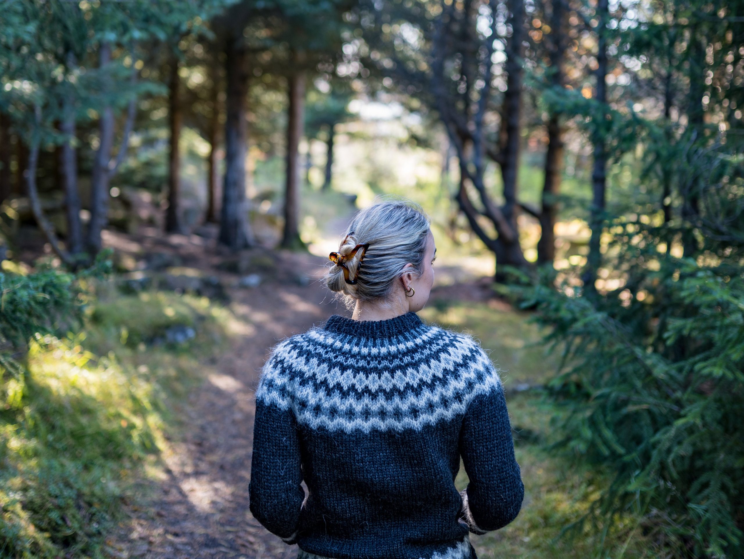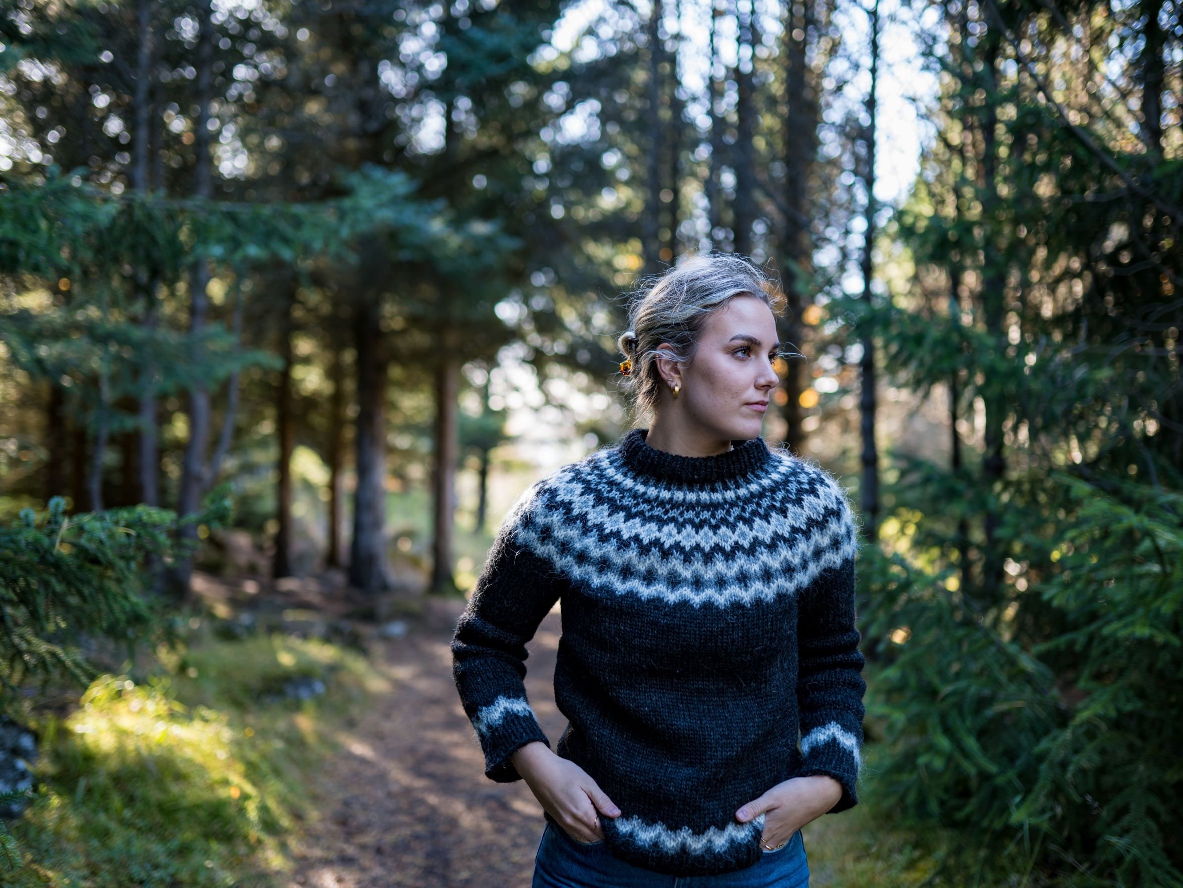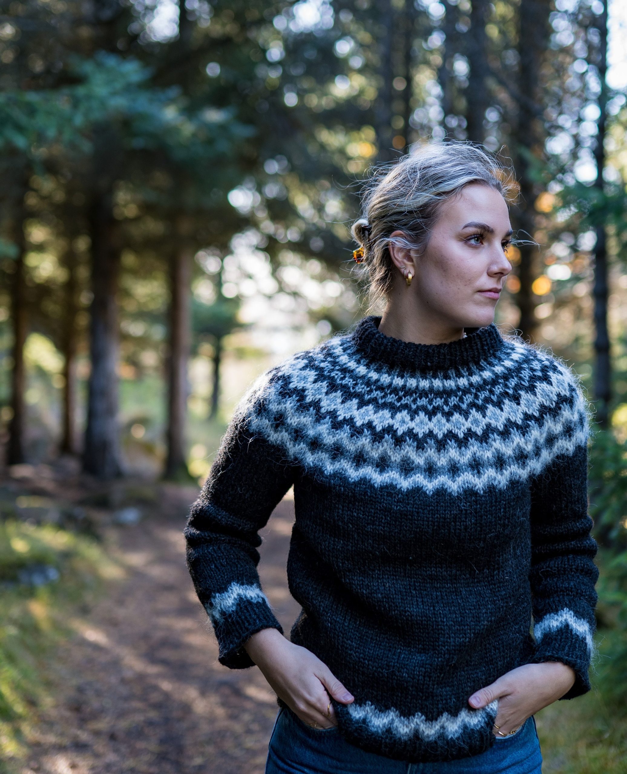 Falleg,klassísk lopapeysa með munstri sem er byggt á gömlum hefðum. Hér er hún í svörtum og gráum  litum, en hægt er að velja um ótal aðrar litasamsetningar.