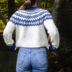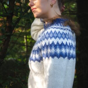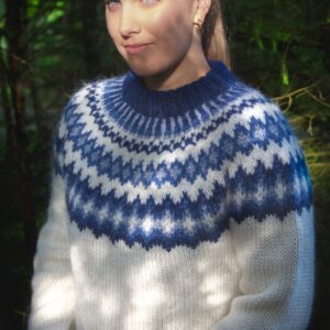 Klassísk lopapeysa með munstri sem er byggt á gömlum hefðum. Hér er hún í hvítum aðallit með bláum munsturtónum.